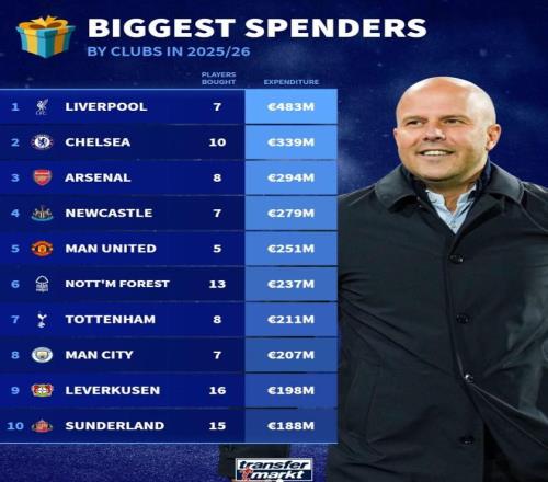 德转列本赛季俱乐部引援支出前10:英超9席,利物浦4.83亿第1